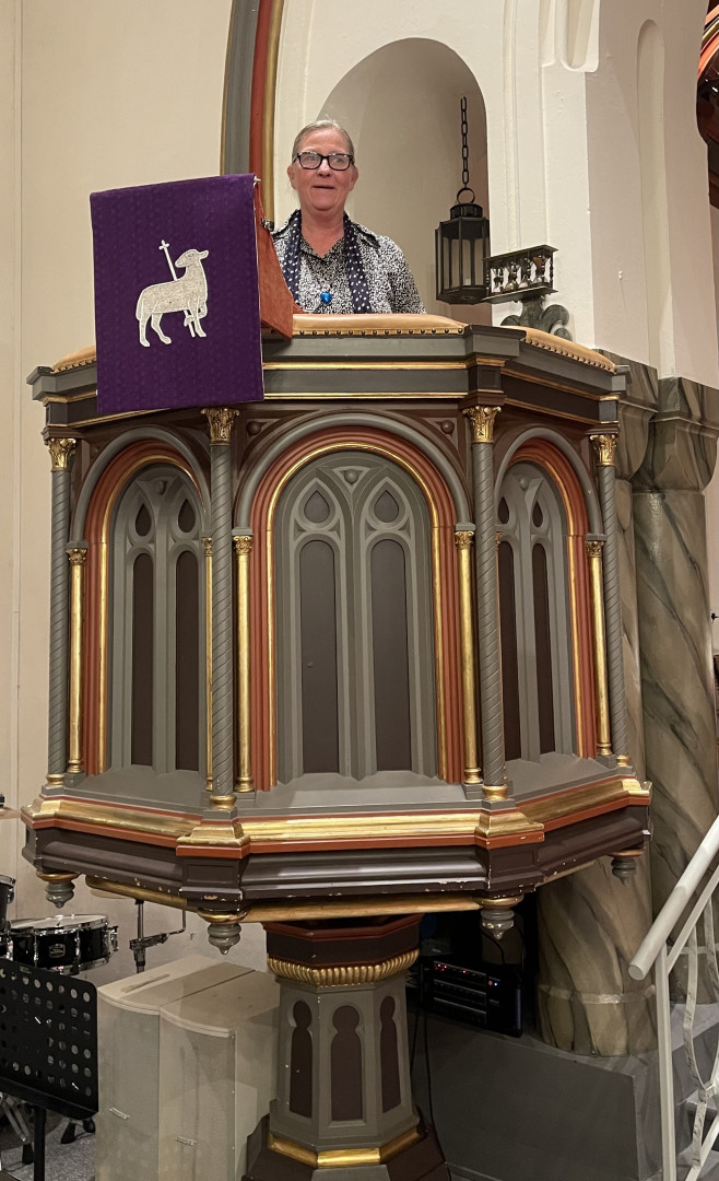 Larvik kirke har et fantastisk orgel. Det fikk vi til fulle demonstrert gjennom en minikonsert av ekteparet Poupart – Vigdis som er organist i kirken, og Sandefjord Rotaryklubbs egen Guy. De bød blant annet på stykker av Händel, Schumann og selveste Adagio av Albinoni – eller av Remo Giazotto som har vist seg å være den egentlige komponisten. Det lød fantastisk!