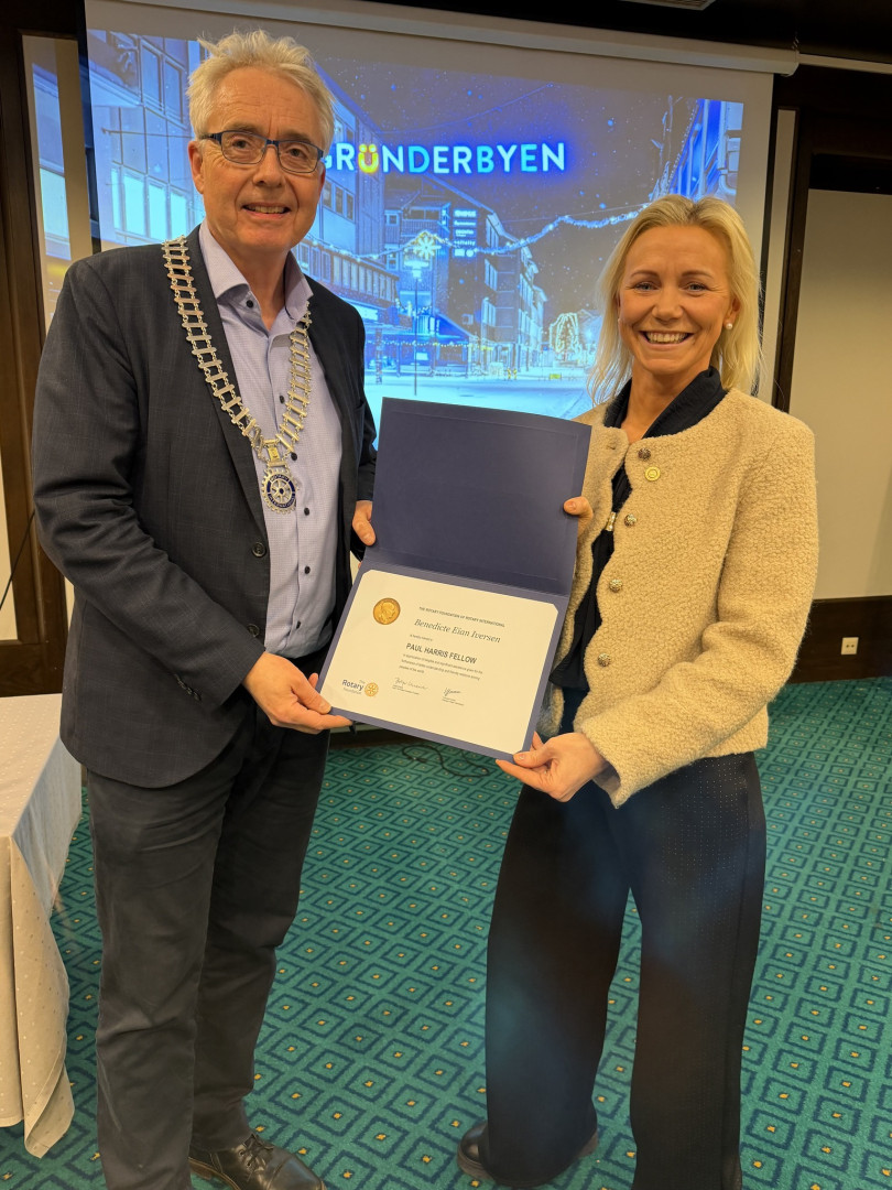 I dag har vi hedret daglig leder i Gründeriet Sandefjord, Benedicte Eian Iversen med Paul Harris Fellow. Paul Harris var en suksessfull amerikansk gründer - han grunnla nemlig Rotary i 1905. Etter hans død opprettet Rotary International æresbevisningen Paul Harris Fellow som kan deles ut av Rotaryklubber til enkeltpersoner som har gjort et ekstraordinært samfunnsgagnlig arbeid. Dette er en hedersbevisning som henger høyt - blant tidligere mottakere finner vi for eksempel Jimmy Carter, Neil Armstrong, Bill Gates og Mor Teresa.
